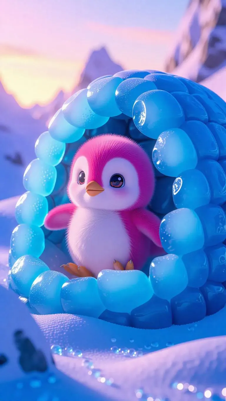 A 3D-cartoon-style cute bubblegum-pink penguin hatchling emerges from an igloo-shaped nest sculpted from frosted blueberry ice crystals. Dawn paints the Antarctic sky in peach hues, casting long violet shadows across glaciers embedded with crushed sapphire deposits. The chick's fluffy plumage shifts from blush to coral tones as it waddles through snowdrifts glittering with blue diamond dust, each step activating