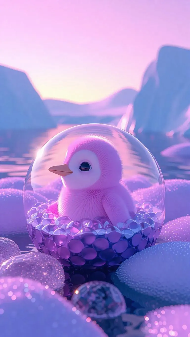 A 3D-cartoon-style cute bubblegum-pink penguin hatchling emerges from a dome-shaped nest crafted from frosted lemon ice crystals. Dawn paints the Antarctic sky in lavender hues, casting long azure shadows across glaciers embedded with crushed emerald deposits. The chick's fluffy plumage shifts from blush to bubblegum tones as it waddles through frost-covered banks glimmering with white diamond dust, each step activating