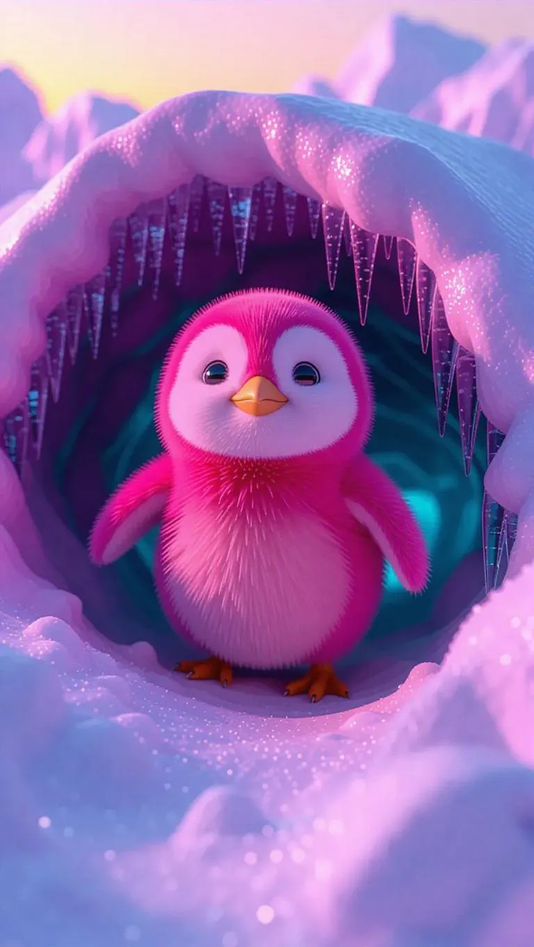 A 3D-cartoon-style cute bubblegum-pink penguin hatchling emerges from a frosty burrow crafted from frosted orange ice crystals. Dawn paints the Antarctic sky in raspberry hues, casting long lavender shadows across glaciers embedded with crushed jade deposits. The chick's fluffy plumage shifts from blush to cherry tones as it waddles through snowdrifts glimmering with pink diamond dust, each step activating