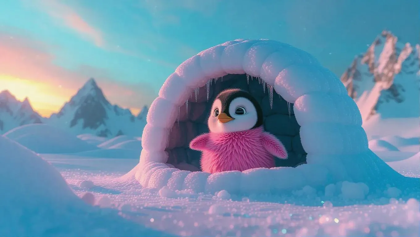 A 3D-cartoon-style lively bubblegum-pink penguin hatchling emerges from an igloo-shaped nest crafted from frosted strawberry ice crystals. Dawn paints the Antarctic sky in coral hues, casting long teal shadows across glaciers embedded with crushed cocoa deposits. The chick's fluffy plumage shifts from blush to raspberry tones as it waddles through snowdrifts twinkling with lavender diamond dust, each step activating