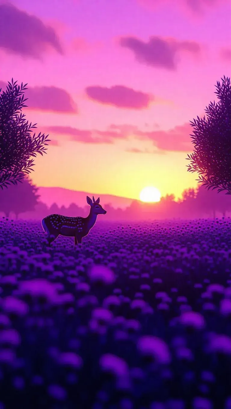 A calm purple world where a small deer is wandering through a field of purple wildflowers. The sky is a sunset orange hue, and the sun is setting, casting a gentle purple glow over the landscape. The scene feels dreamy and soft.