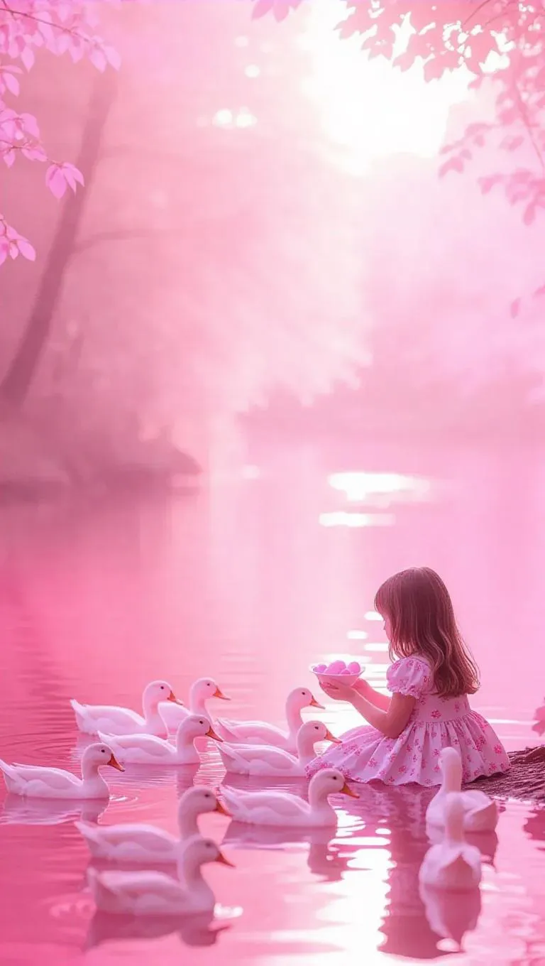 A soft pink world where a little girl in a floral dress is sitting by a pink lake, feeding a flock of pink ducks. The water shimmers with a gentle pink glow, and the sky is a soft lavender hue. Soft sunlight filters through the trees, creating a serene and peaceful scene.