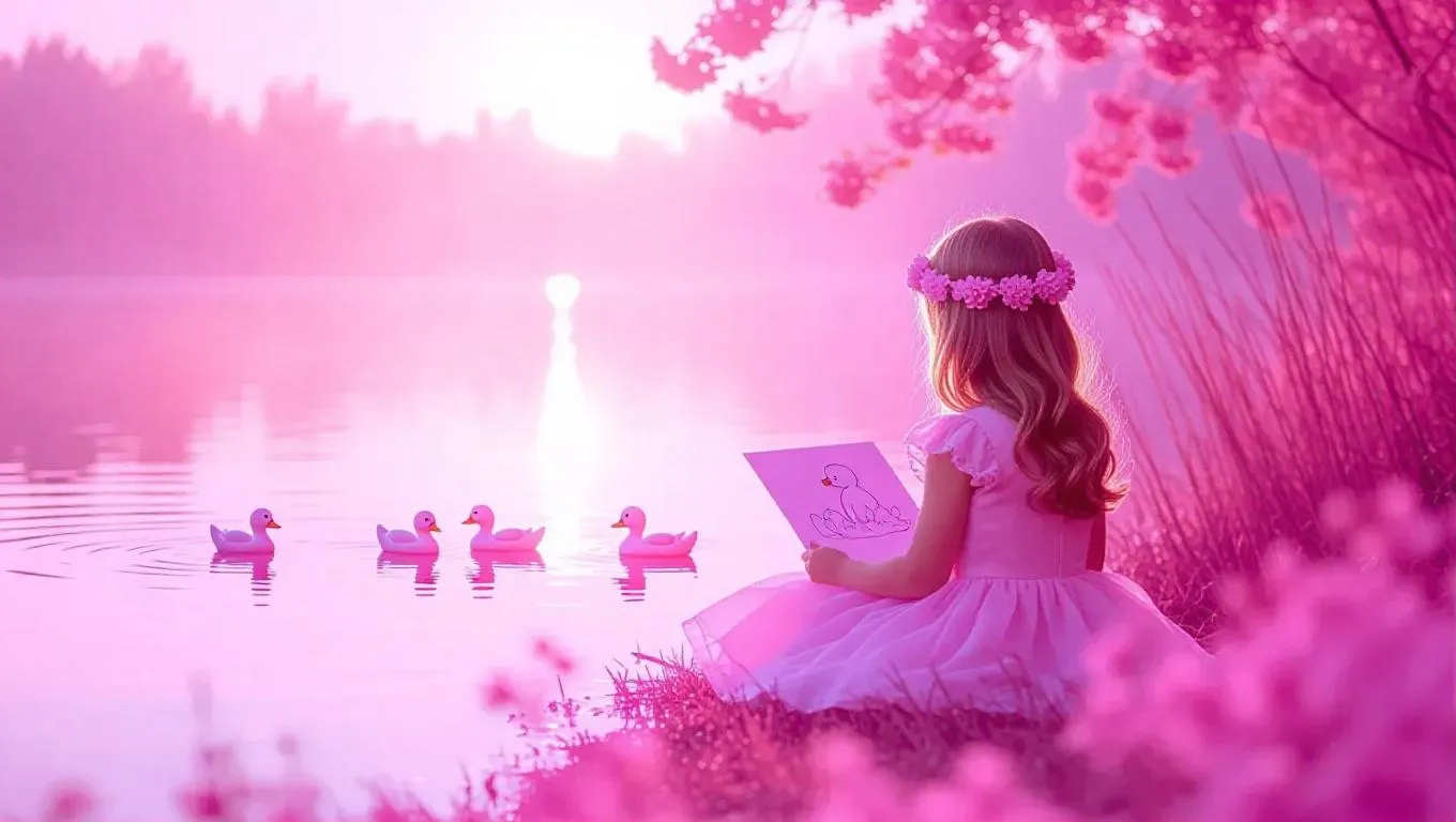 A soft pink world where a little girl in a pastel pink dress is sitting by a pink lake, drawing a picture of pink ducks. The water shimmers with a gentle pink glow, and the sky is a soft lavender hue. Soft sunlight filters through the flowers, creating a serene and peaceful scene.