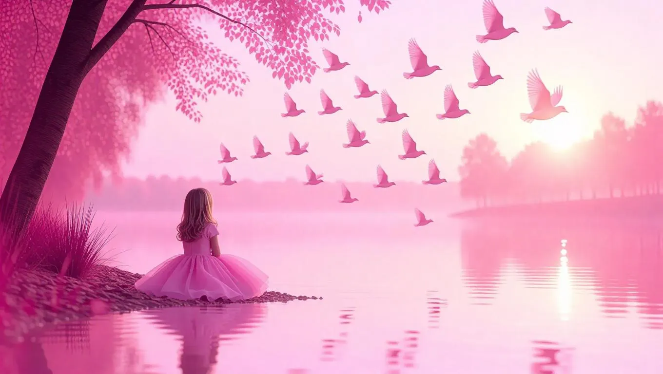 A soft pink world where a little girl in a pastel pink dress is sitting on the shore of a pink lake, watching a flock of pink birds fly by. The water shimmers with a gentle pink glow, and the sky is a soft lavender hue. Soft sunlight filters through the trees, creating a serene and peaceful scene.