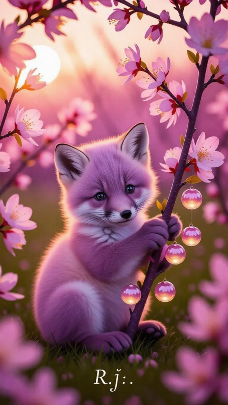 A lavender-hued fox cub snuggles among luminous fruit tree branches in a garden filled with golden sunset hues. Translucent leaves catch soft peach light, casting delicate shapes onto the cub's downy fur, which morphs from lavender to lemon shades with every twitch. Lovely fruit blossoms whisper between radiant branches that sparkle with embedded quartz beads, their hollow sections nurturing small luminous insects glowing quietly. The cub's paws clench a fruit tree limb glistening with sweet purple juice that crystallizes into lovely orbs mid-air, creating suspended pieces of art. Soft bokeh effects expand distant vistas where fruit tree blossoms fade into watercolor combinations of teal and soft cream, created with textured artistic strokes reminiscent of fine sugar and wax resist techniques.