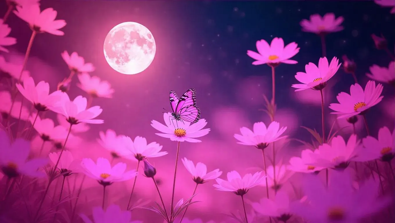 A soft pink world where a small butterfly is resting on a pink flower in a moonlit garden. The garden is filled with pastel-colored flowers, and the air is filled with a gentle breeze. The scene feels mystical and magical.