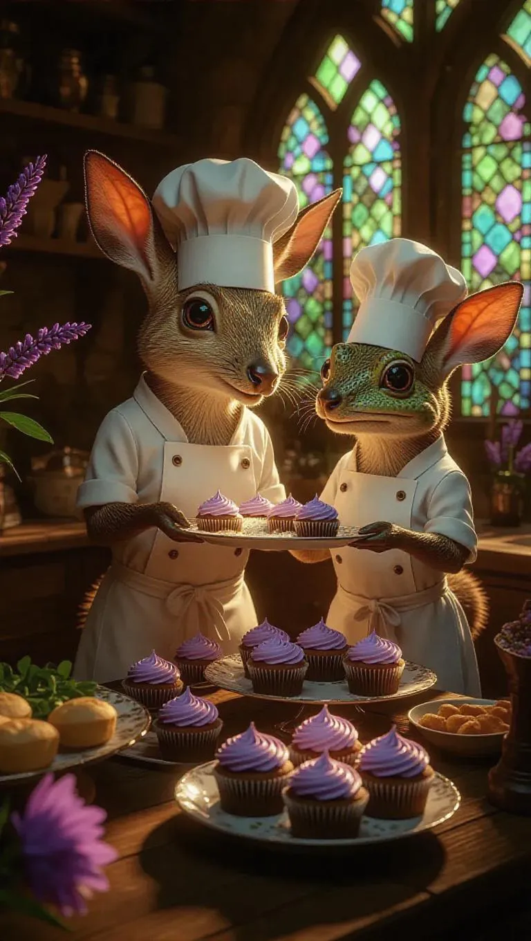 Animal chefs in a whimsical, enchanted kitchen. Deer wearing a chef hat, folding batter for lavender cupcakes. Floral tiles, magical light streaming through stained glass. Frog sautéing greens, butterfly sprinkling sugar. Floral cupcakes, herb-infused breads, lavender cookies. Dreamy, mystical, sweet, enchanting mood.