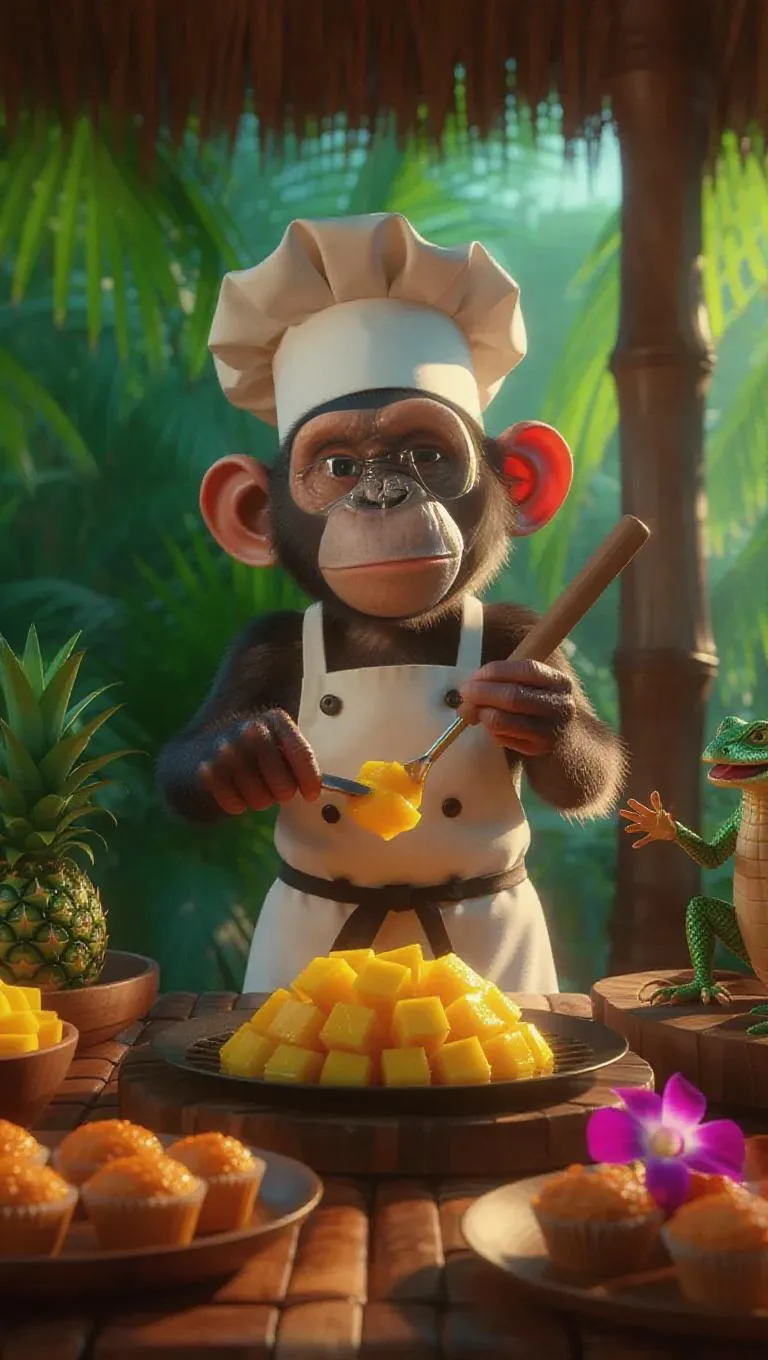 Animal chefs in a tropical, colorful kitchen. Monkey wearing a chef hat, whipping up mango sticky rice. Bamboo tiles, bright sunlight filtering through palm leaves. Tortoise grilling skewers, lizard mixing salsa. Pineapple tarts, spicy chips, coconut muffins. Exotic, lively, festive, cheerful mood.