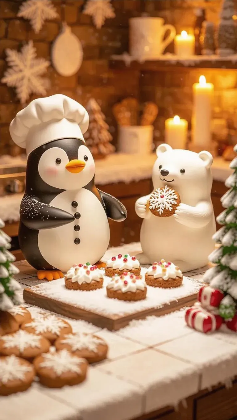 Animal chefs in a snowy, cozy kitchen. Penguin wearing a chef hat, preparing hot chocolate. Icy tiles, warm light illuminating the space. Seal decorating cookies, polar bear making s’mores. Marshmallow treats, gingerbread houses, hot cocoa. Warm, cozy, sweet, festive mood.