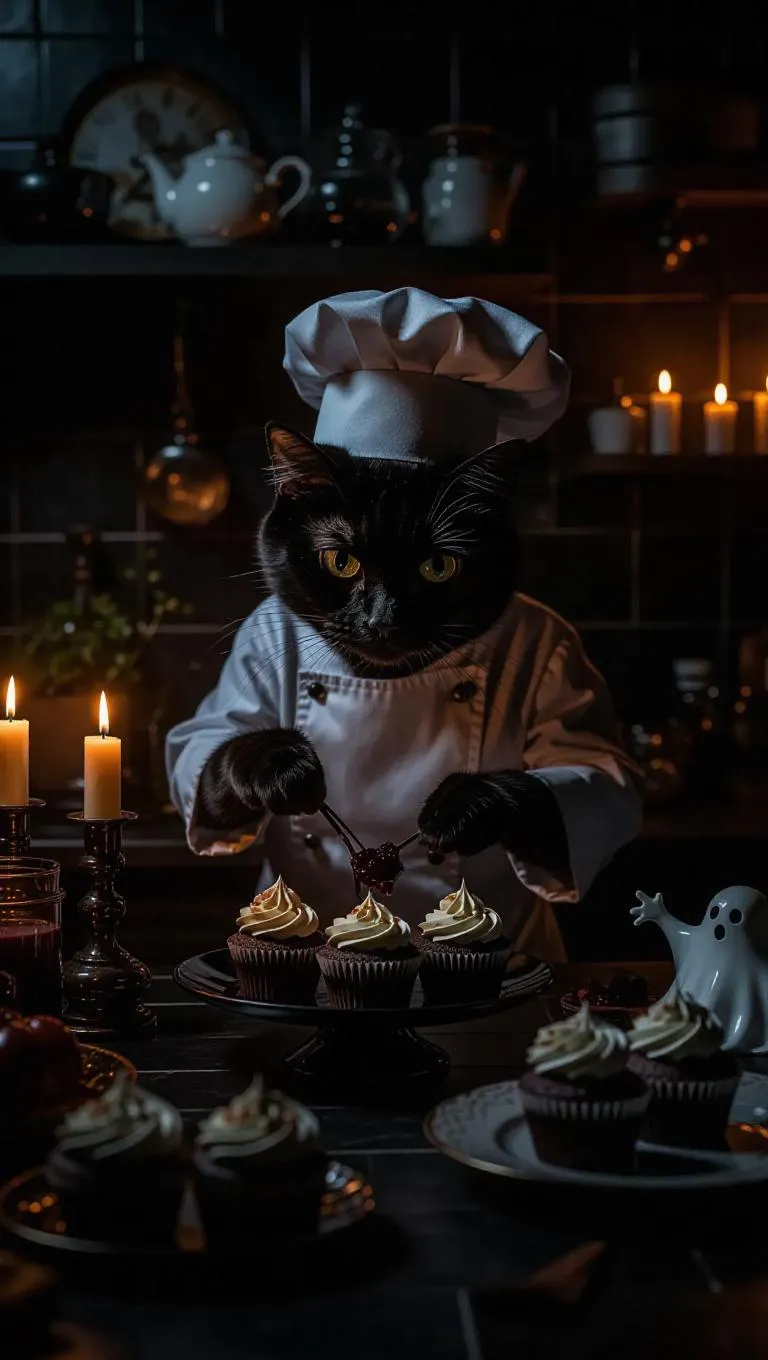 Animal chefs in a dark, moody kitchen. Bat wearing a chef hat, crafting spooky desserts. Dim tiles, candlelight flickering shadows. Spider blending potions, ghost floating with herbs. Monster cupcakes, eerie jelly, black velvet cake. Mysterious, spooky, thrilling, haunting mood.