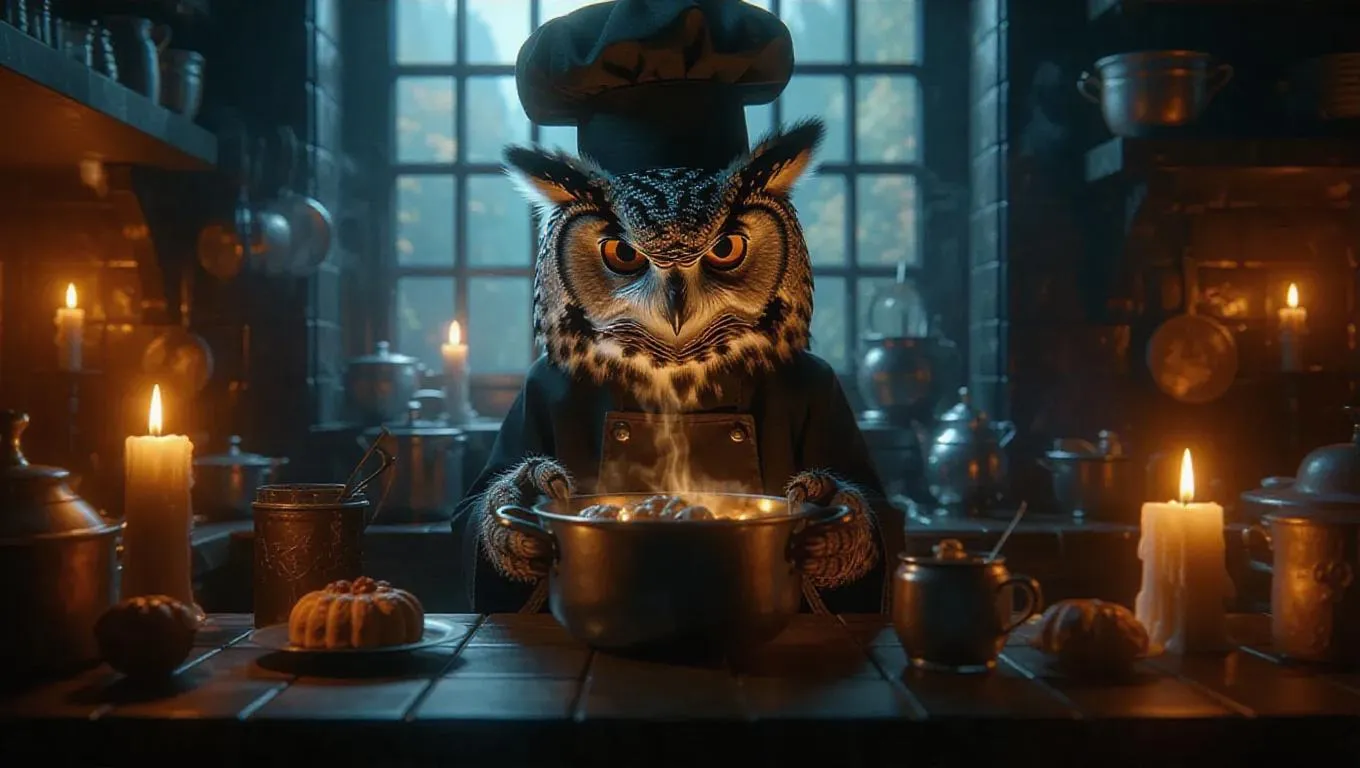 Animal chefs in a mysterious, shadowy kitchen. Owl wearing a chef hat, brewing potions. Dark tiles, flickering candlelight adding ambience. Fox adding secret spices, ghost floating about. Enchanted desserts, mystical brews, eerie pastries. Intriguing, mysterious, magical, shadowy mood.