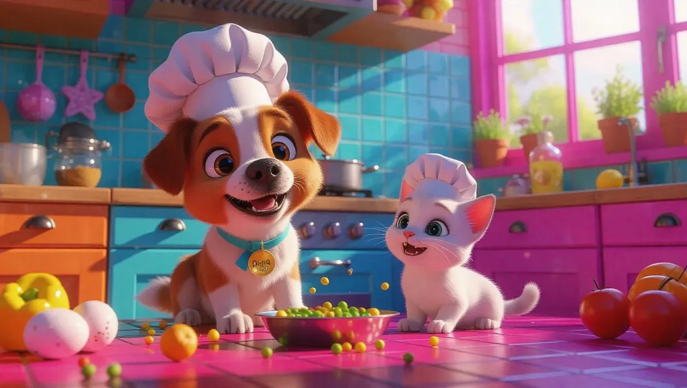 Animal chefs in a playful, cartoonish kitchen. Puppy wearing a chef hat, splattering ingredients everywhere. Colorful tiles, whimsical light bouncing around. Cat sliding across the floor, bird cracking eggs. Silly shapes, fun treats, goofy snacks. Playful, humorous, lively, animated mood.
