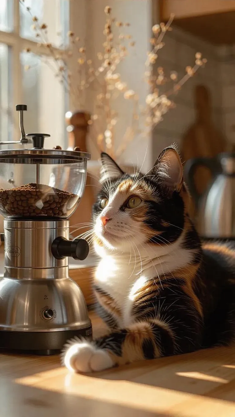 A majestic calico cat reclines beside a coffee grinder, thoughtfully observing the process with intelligent eyes. The cat's composed demeanor and soft rumble fill the spacious, sunlit kitchen. Gentle morning light streams through the window, softly illuminating the cat and the grinder, enriching the calming vibe. The scene is painted in a photorealistic style, focusing on the serene essence.