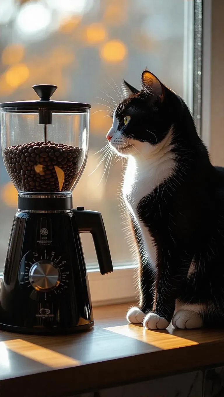 A calm black and white cat sits beside a coffee grinder, patiently observing the handle turn with thoughtful paws. The cat's reflective expression and gentle purring complement the minimalist, stylish kitchen. Bright evening light spills through the window, bathing the cat and the grinder in warm tones, enhancing the tranquil setting. The scene is rendered in a minimalist style, capturing the essence of stillness.