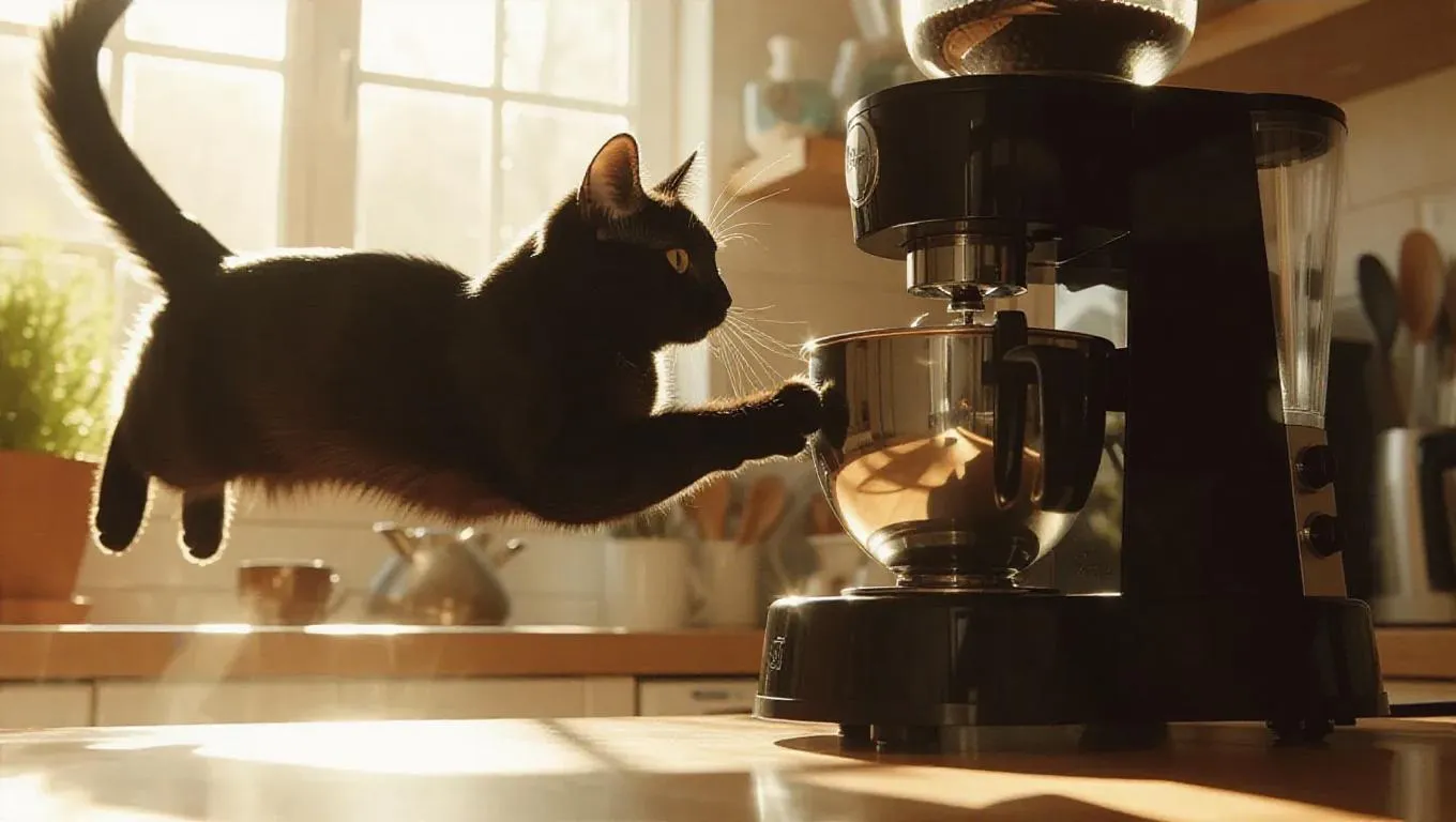 An energetic black cat jumps beside a coffee grinder, playfully nudging the handle with its nose. The cat's inquisitive expression and light mewl resonate in the bright, airy kitchen. Bright, sparkling light bursts through the window, casting energetic rays on the cat and the grinder, creating a vibrant atmosphere. The scene is rendered in a playful, dynamic style, emphasizing the spirited interaction.