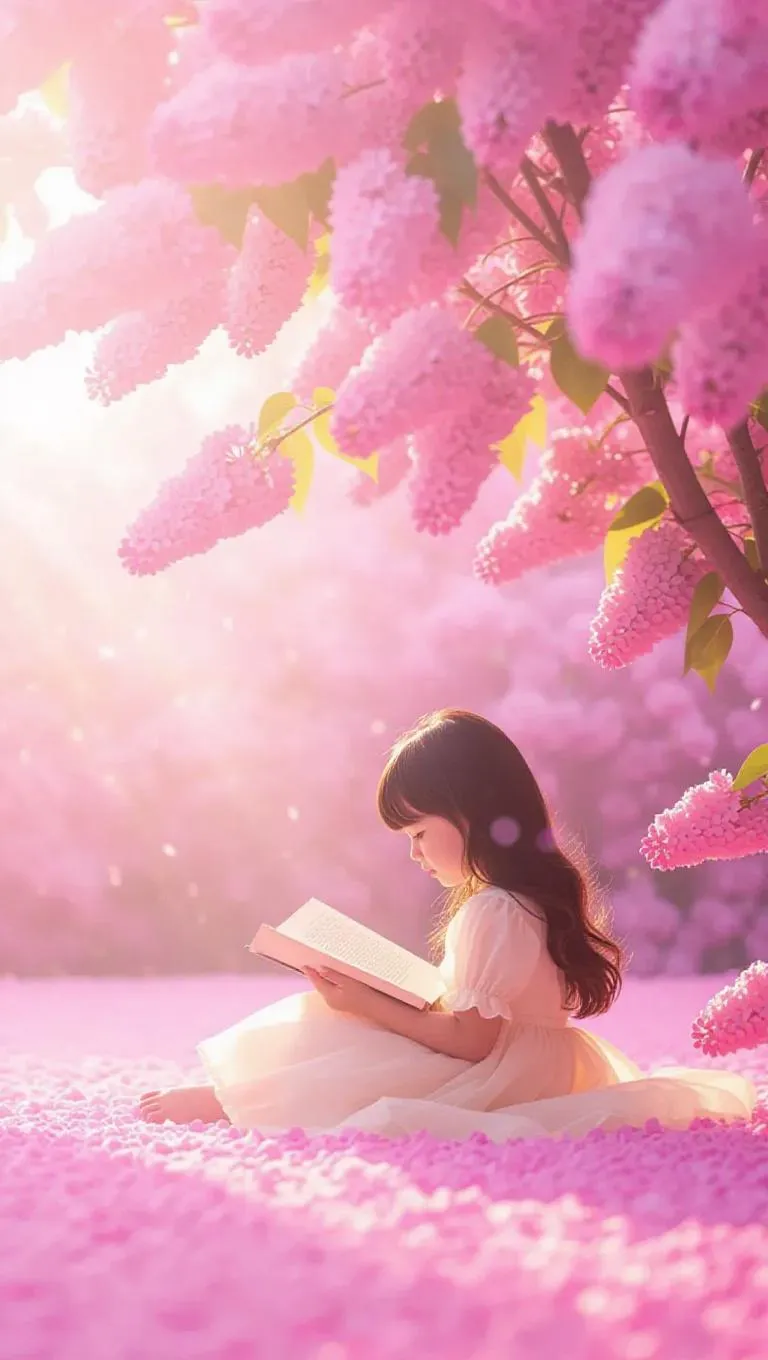 A dreamy coral world where a little girl in a pastel yellow dress is reading a book under a fragrant lilac bush. The ground is covered in fallen lilac petals, and the sky is a gentle coral hue. Soft sunlight filters through the branches, creating a serene and whimsical scene.