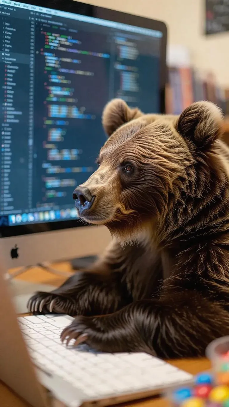 The cute fluffy brown bear sits at a desk adorned with snacks, its paws gently tapping the keyboard as it types tentatively. The bear glances cheerfully at the computer screen, where a digital process scrolls slowly, revealing lines of code and data. The camera zooms in on the bear’s joyous expression, capturing the tension and curiosity in its eyes.