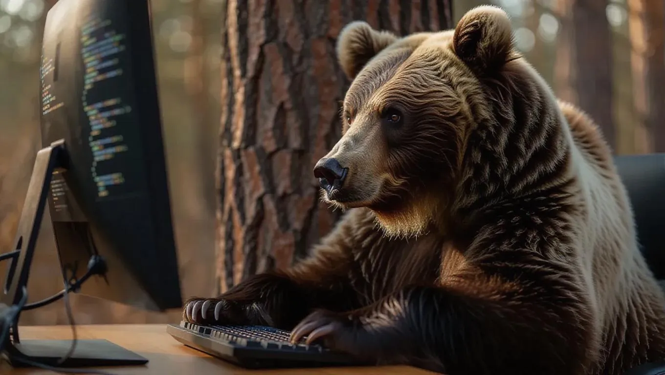 The fluffy brown bear sits under a tree at a desk, its paws tapping the keyboard softly as it types slowly. The bear glances doubtfully at the computer screen, where a digital process cycles, revealing lines of code and data. The camera zooms in on the bear’s inquisitive expression, capturing the tension and curiosity in its eyes.