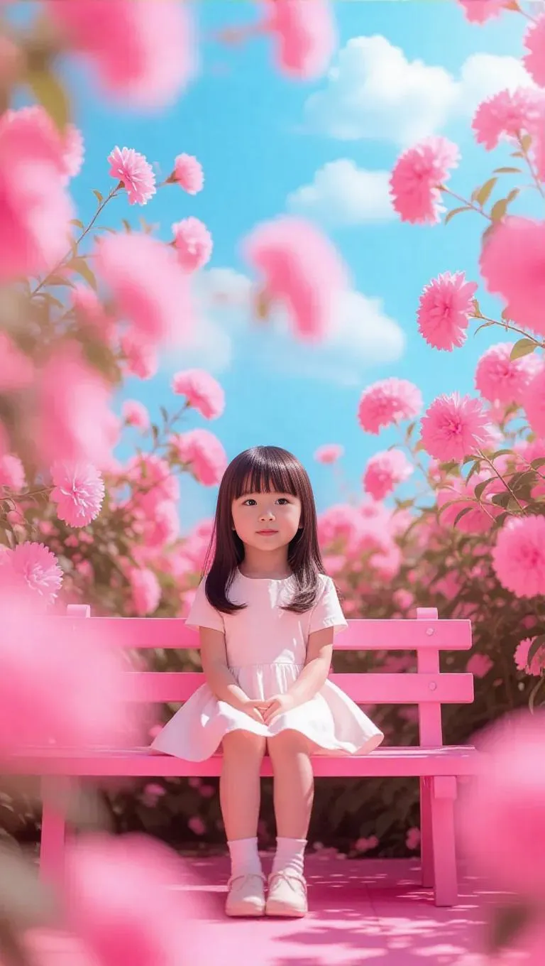 A gentle pink world where a little girl is sitting on a pink bench in a vibrant garden. She is surrounded by pink flowers and soft greenery, and the sky is a bright blue hue. The scene feels energetic and refreshing.
