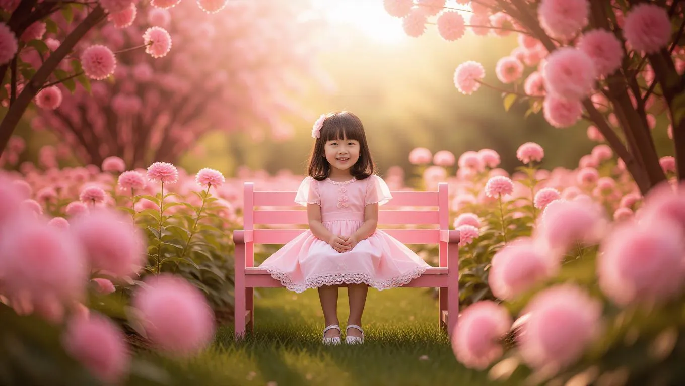 A gentle pink world where a little girl is sitting on a pink bench in a garden. She is surrounded by pink flowers and soft greenery, and the sky is a soft yellow hue. The scene feels bright and cheerful.