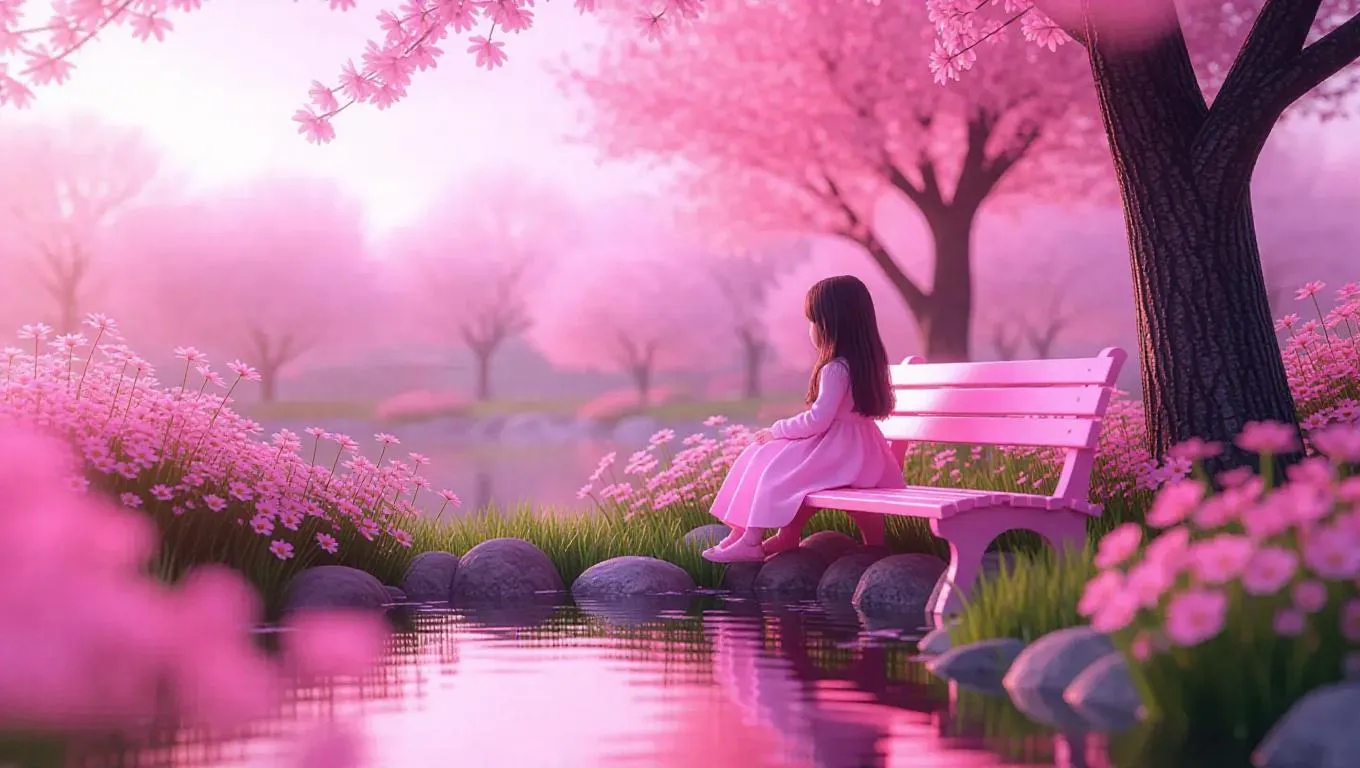 A gentle pink world where a little girl is sitting on a pink bench beside a pond. She is surrounded by pink flowers and soft greenery, and the sky is a soft lavender hue. The scene feels serene and refreshing.