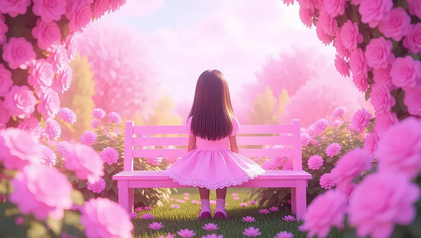 A gentle pink world where a little girl is sitting on a pink bench in a cozy garden. She is surrounded by pink flowers and soft greenery, and the sky is a soft lavender hue. The scene feels snug and comforting.
