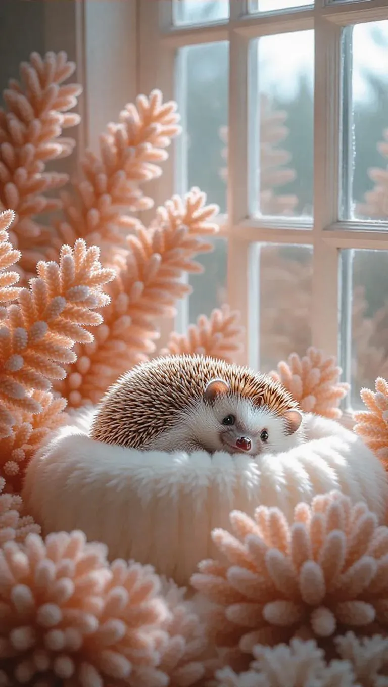A playful coral world where a small hedgehog is curled up on a fluffy coral pillow in a sunlit room. The window is open, and coral leaves drift gently inside, landing on the hedgehog’s back. The room is filled with soft pastel colors, creating a cozy and dreamy atmosphere.
