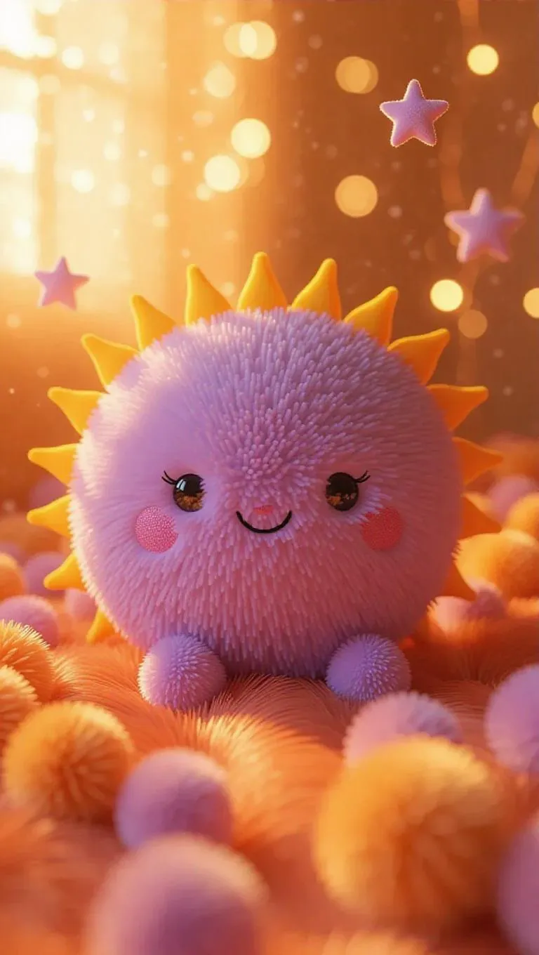 A whimsical depiction of the Sun in Jellycat style, where the star is rendered as a giant, fluffy ball of soft, lavender fur. The solar flares are depicted as plush, dreamy tendrils, and the surface is soft and inviting. The entire scene is bathed in warm, soft light, creating a cozy and relaxed atmosphere. The style is playful and cuddly, perfect for a children's book or a sweet home decor piece.