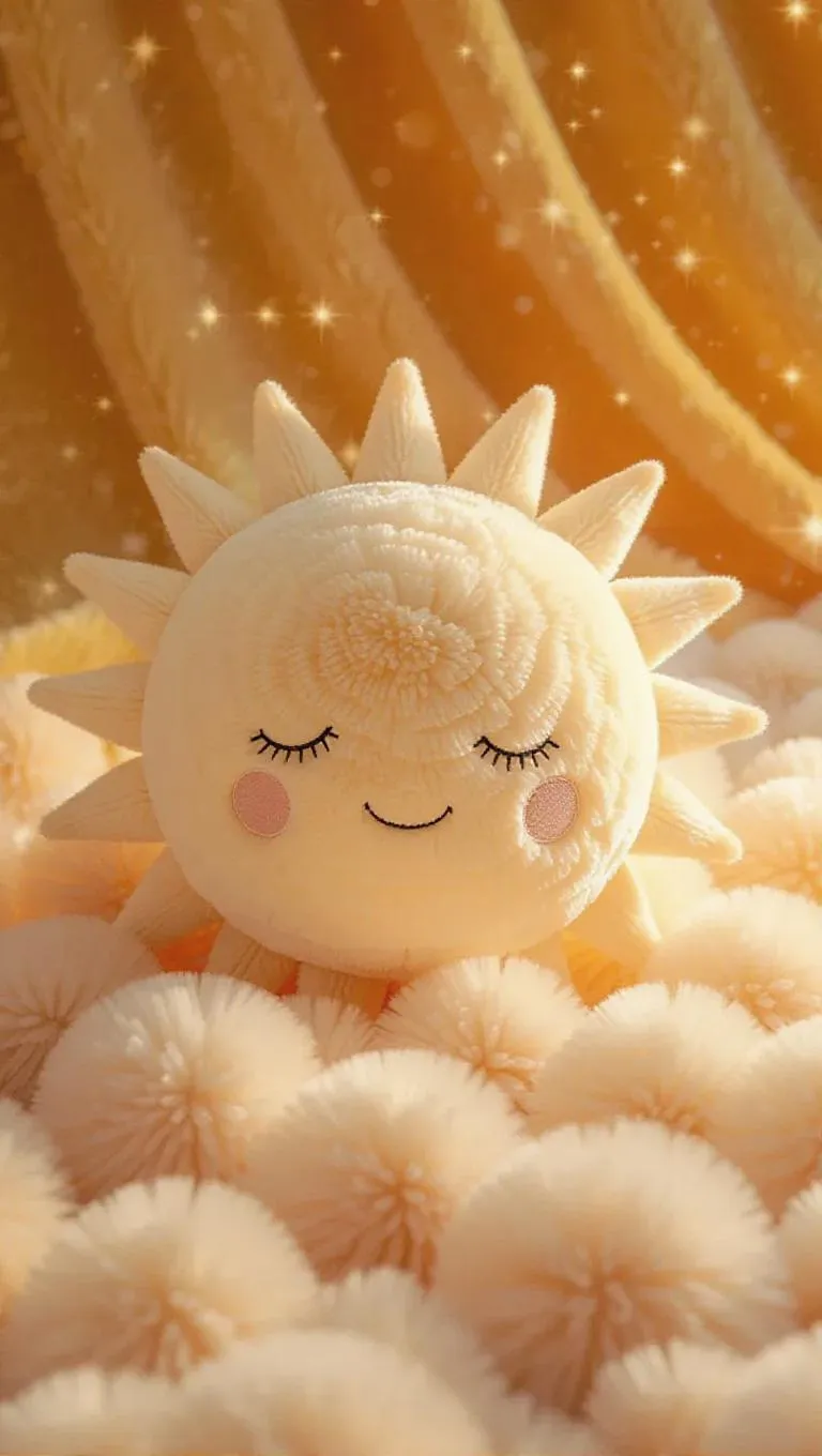 A whimsical depiction of the Sun in Jellycat style, where the star is rendered as a giant, fluffy ball of soft, cream fur. The solar flares are depicted as plush, swirly tendrils, and the surface is soft and cloud-like. The entire scene is bathed in warm, creamy light, creating a comforting and tranquil atmosphere. The style is playful and cuddly, perfect for a children's book or a cozy decor piece.