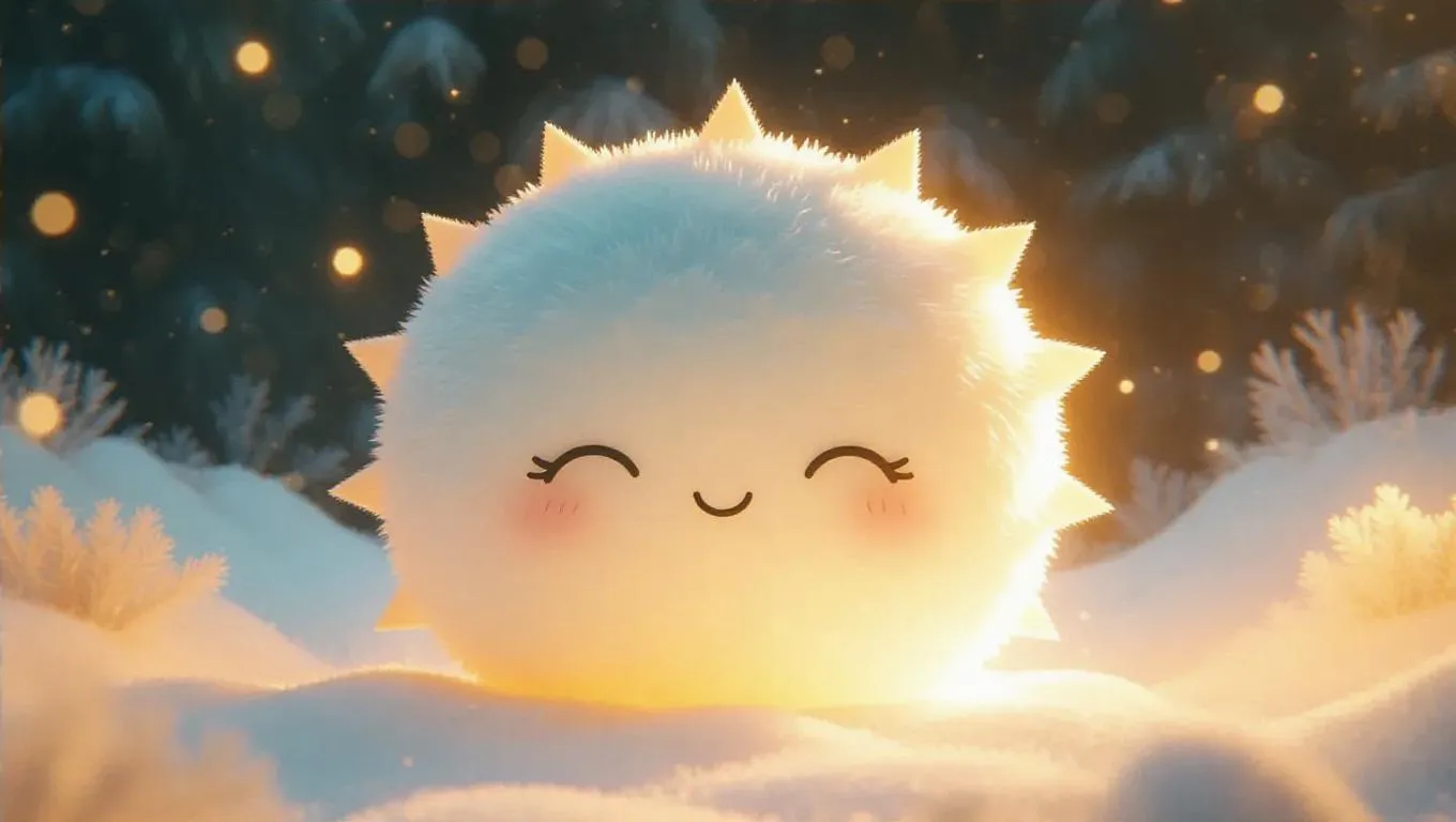 A whimsical depiction of the Sun in Jellycat style, where the star is rendered as a giant, fluffy ball of soft, light blue fur. The solar flares are depicted as plush, feather-like tendrils, and the surface is soft and lighthearted. The entire scene is bathed in soft, ethereal light, creating a magical and whimsical atmosphere. The style is playful and cuddly, perfect for a children's book or a dreamy home decor piece.