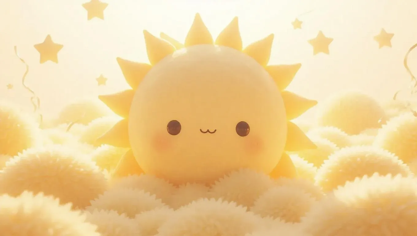 A whimsical depiction of the Sun in Jellycat style, where the star is rendered as a giant, fluffy ball of soft, butter-colored fur. The solar flares are depicted as plush, flowing tendrils, and the surface is soft and hazy. The entire scene is bathed in soft, buttery light, creating a warm and comforting atmosphere. The style is playful and cuddly, perfect for a children's book or a cozy decor piece.