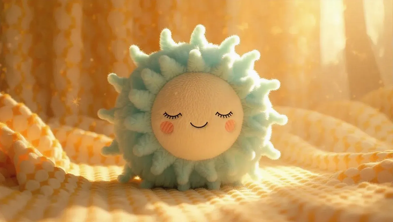 A whimsical depiction of the Sun in Jellycat style, where the star is rendered as a giant, fluffy ball of soft, seafoam green fur. The solar flares are depicted as plush, curling tendrils, and the surface is soft and dreamy. The entire scene is bathed in warm, inviting light, creating a peaceful and comforting atmosphere. The style is playful and cuddly, perfect for a children's book or a serene home decor piece.