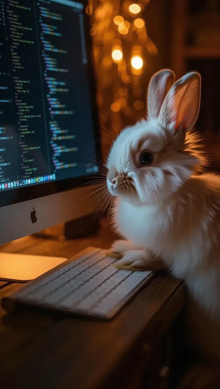 A cute fluffy white rabbit sits at a vintage wooden desk, its paws delicately tapping the keyboard as it types slowly. The rabbit glances suspiciously at the computer screen, where a digital process scrolls, revealing intricate lines of code and data. The camera zooms in, capturing the tension and curiosity in the rabbit’s focused eyes, set against a backdrop of soft, ambient lighting.