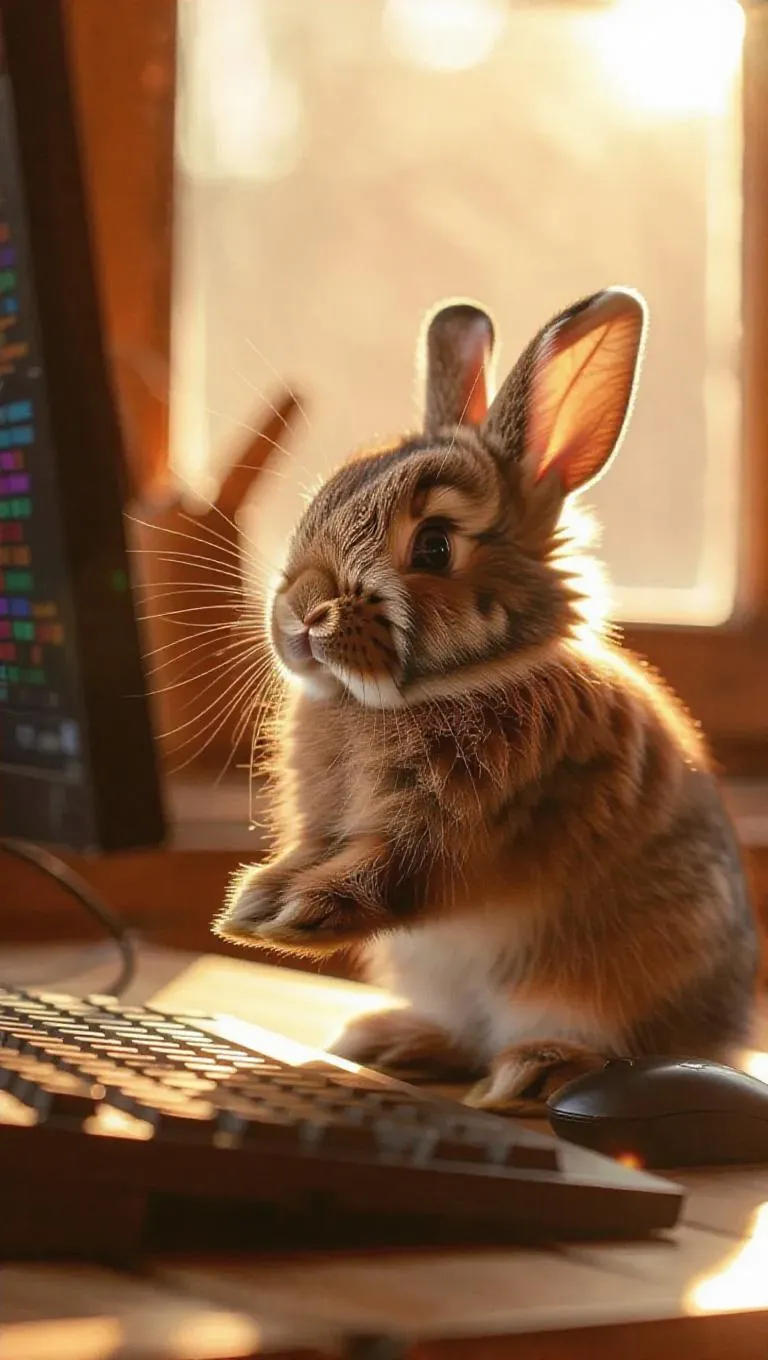 A playful fluffy brown rabbit sits at a vintage wooden desk, its paws gently pressing the keys as it types energetically. The rabbit glances curiously at the computer screen, where a digital process scrolls, revealing colorful graphics and data. The camera zooms in, capturing the excitement and determination in the rabbit’s attentive eyes, set against a backdrop of warm, golden lighting.