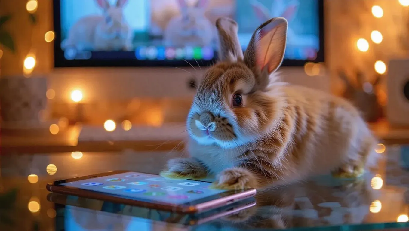 A fluffy pastel rabbit lies on a fancy glass desk, its paws playing with the touchscreen as it explores apps. The rabbit stares at the screen, where funny videos play, revealing hilarious moments. The camera zooms in, capturing the amusement and enjoyment in the rabbit’s amused eyes, set against a backdrop of bright, joyful lighting.