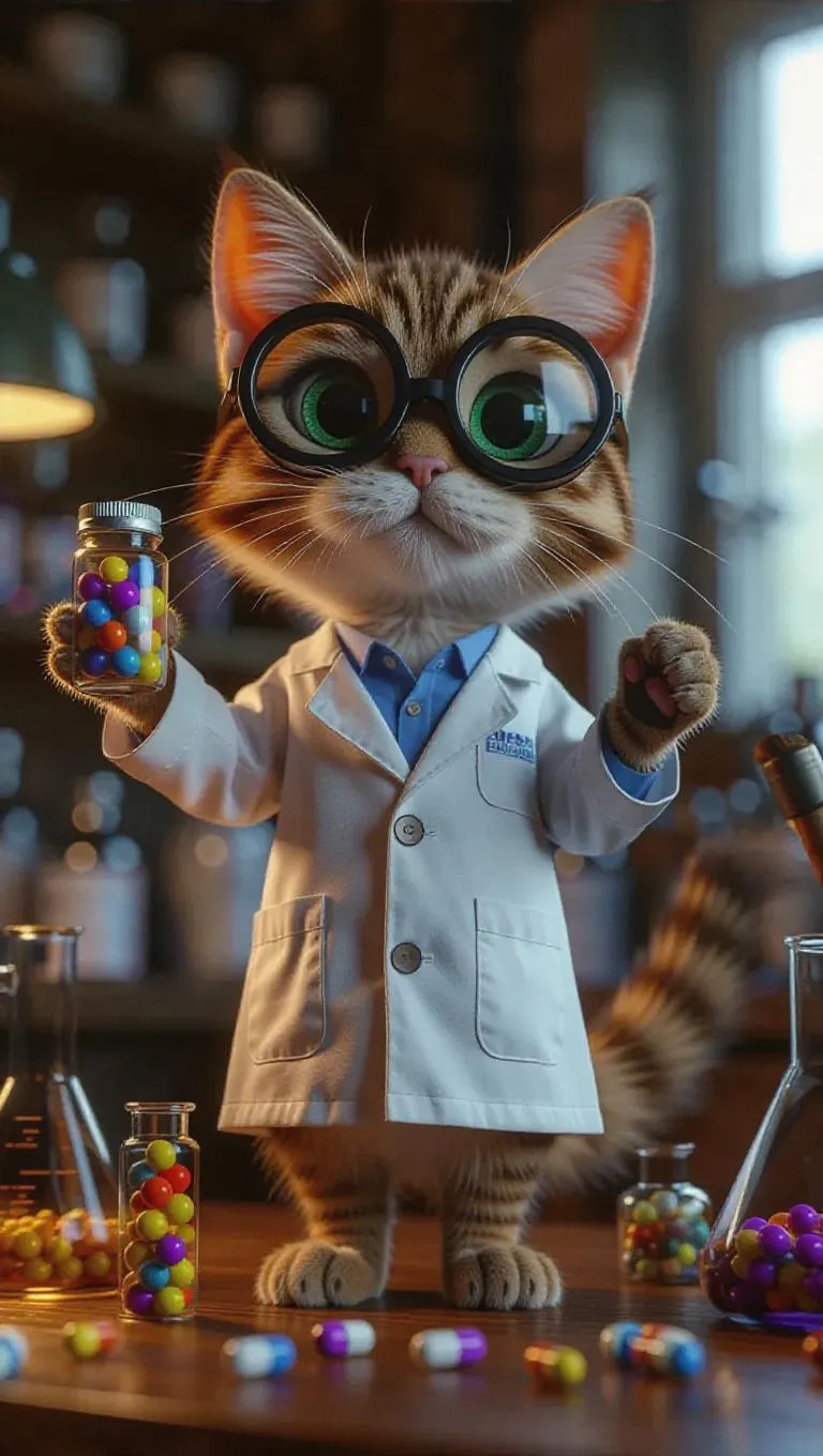 A 3D cat image wearing a scientist's lab coat and goggles, standing upright on one leg like a human, holding a pill bottle filled with colorful pills, surrounded by beakers and lab equipment, exuding a curious and innovative atmosphere, with a spark of creativity in its eyes.