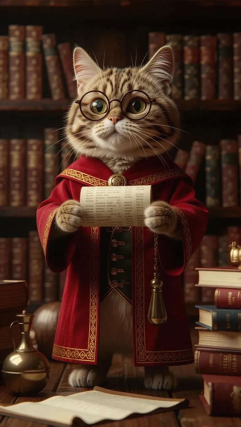 A 3D cat image wearing a historian's robe and glasses, standing upright on two legs like a human, holding an ancient scroll, surrounded by books and artifacts, exuding a scholarly and innovative atmosphere, with a spark of knowledge in its eyes.