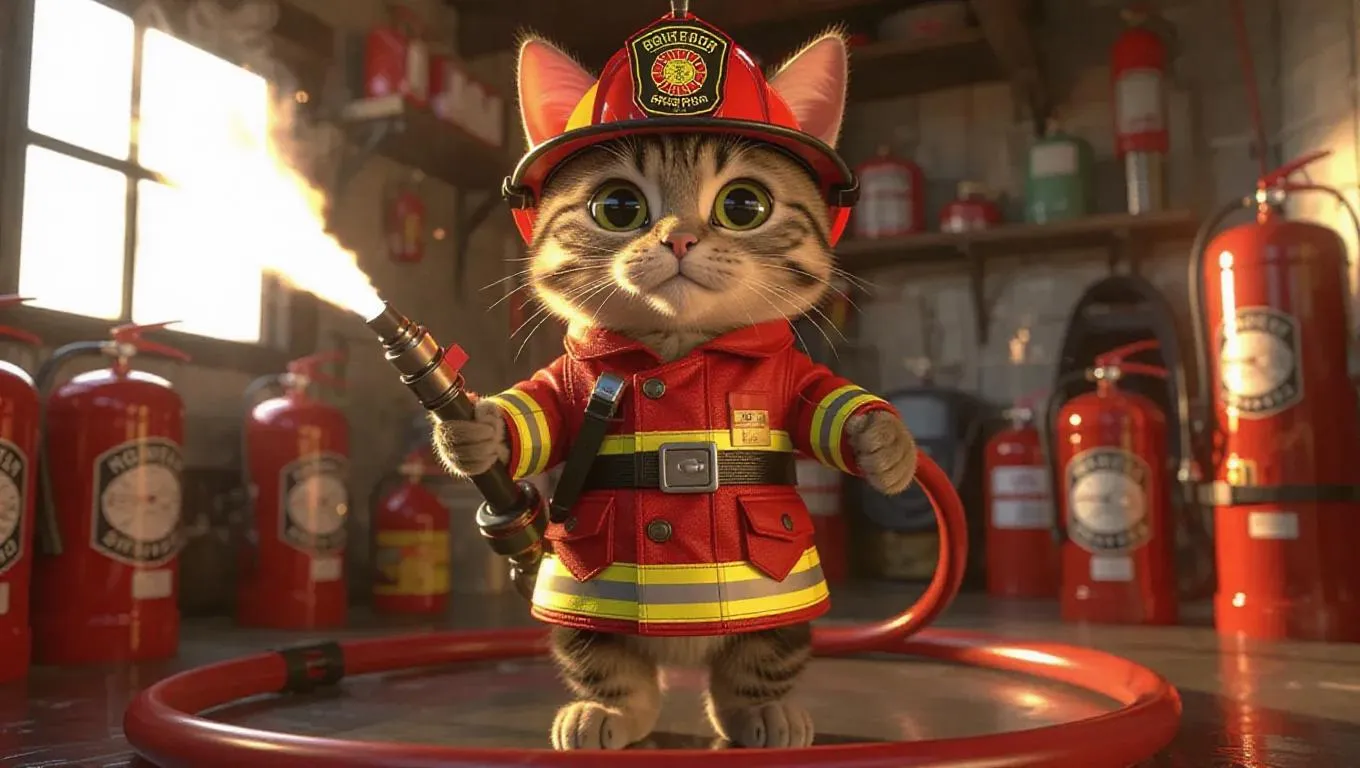 A 3D cat image wearing a firefighter's coat and helmet, standing upright on two legs like a human, holding a fire hose, surrounded by fire extinguishers and emergency tools, exuding a heroic and innovative atmosphere, with a spark of bravery in its eyes.
