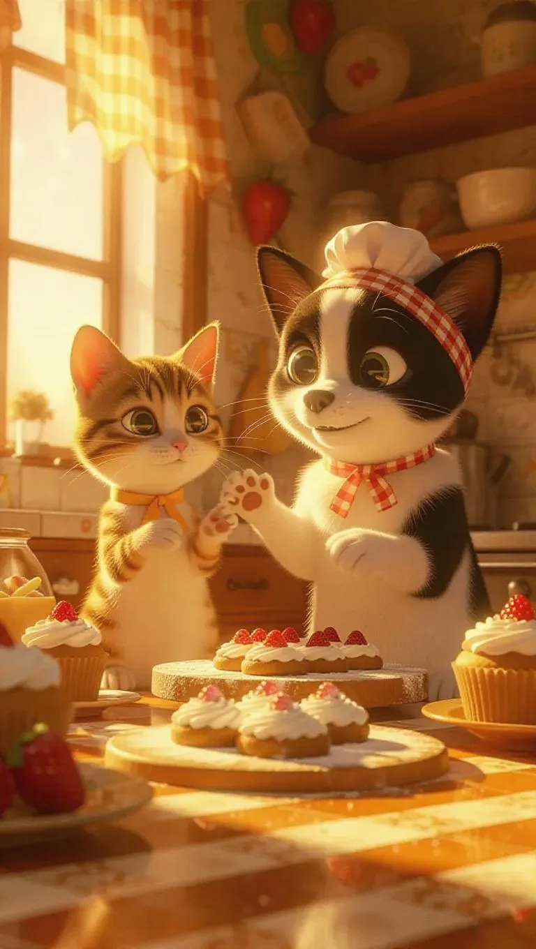 Animal bakers in a charming, cozy kitchen. Cat wearing a headband, rolling out dough for sweet pastries, checkered floor reflecting warm yellow light. Dog icing cupcakes, bird arranging berries. Moon-shaped cookies, fruit platters, strawberry-infused butter. Sweet, delightful, fresh, humorous tone.
