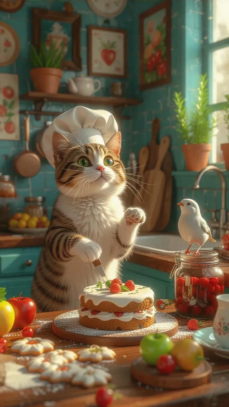 Animal culinary talents in a snug, artistic kitchen. Cat wearing a chef cap, baking a cake, walls adorned with colorful art reflecting sunlight. Dog chopping herbs, bird stirring jam. Circle-shaped cookies, fruit displays, vanilla-infused icing. Creative, vibrant, sweet, cheerful mood.