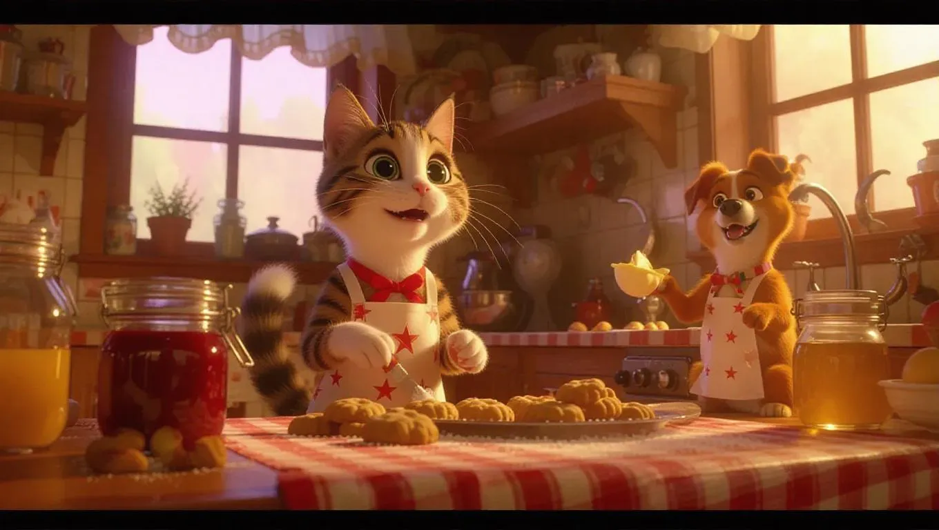 Animal culinary figures in an old-fashioned, vibrant kitchen. Cat sporting a classic apron, making cookies, antique décor reflecting cozy light. Dog measuring flour, bird whisking eggs. Star-shaped pastries, jam jars, honey-infused cream. Homey, lively, sweet, amusing tone.