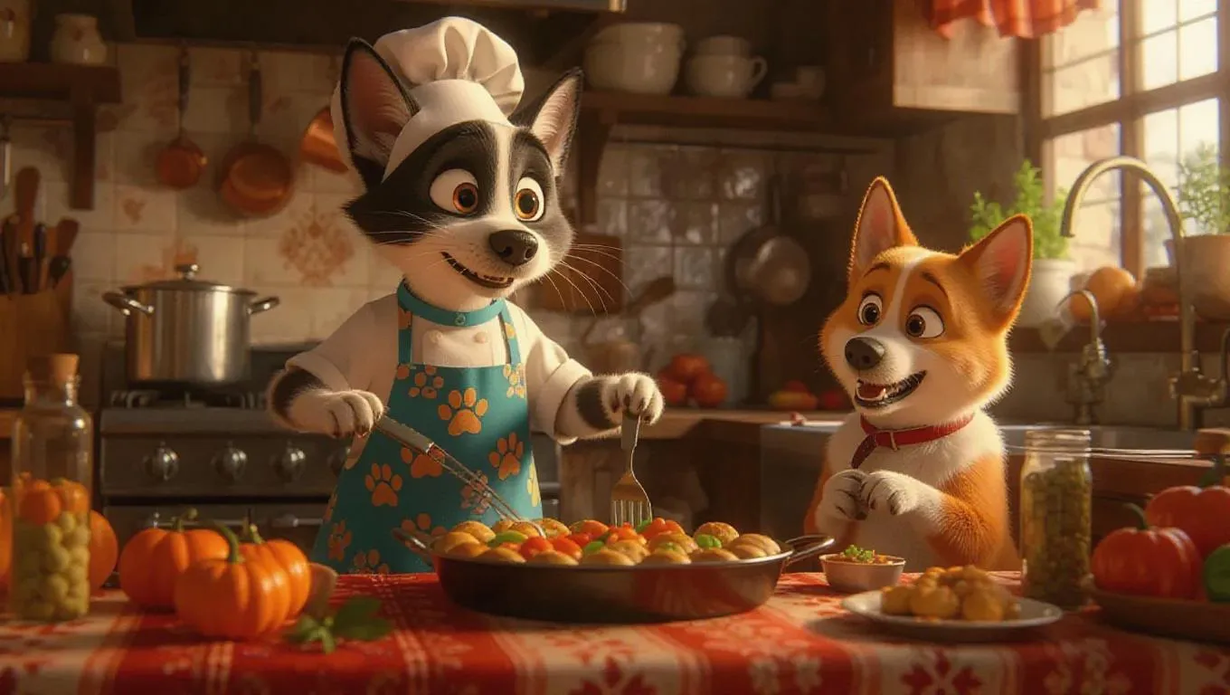 Animal cooks in a fun, eclectic kitchen. Cat in a whimsical apron, preparing a festive feast, quirky decorations filtering sunlight. Dog frying vegetables, bird mixing sauces. Paw-shaped pies, snack trays, herb-infused spreads. Lively, unique, tasty, humorous vibe.