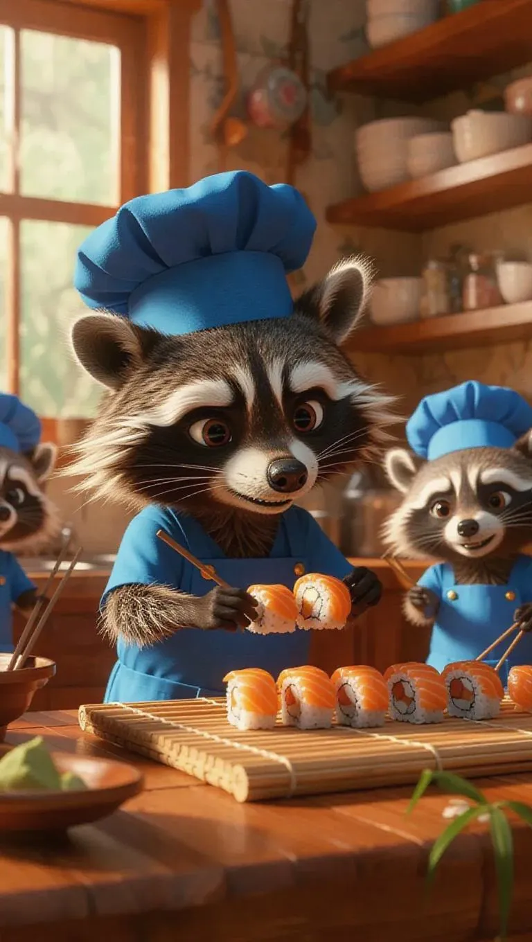 4x image of a cartoonish raccoon wearing a blue apron and chef cap, meticulously rolling sushi on a bamboo mat in a cozy, bright, jungle-themed kitchen. Baby raccoons, also in blue aprons and chef caps, sit on the counter, holding chopsticks, eagerly watching and learning.