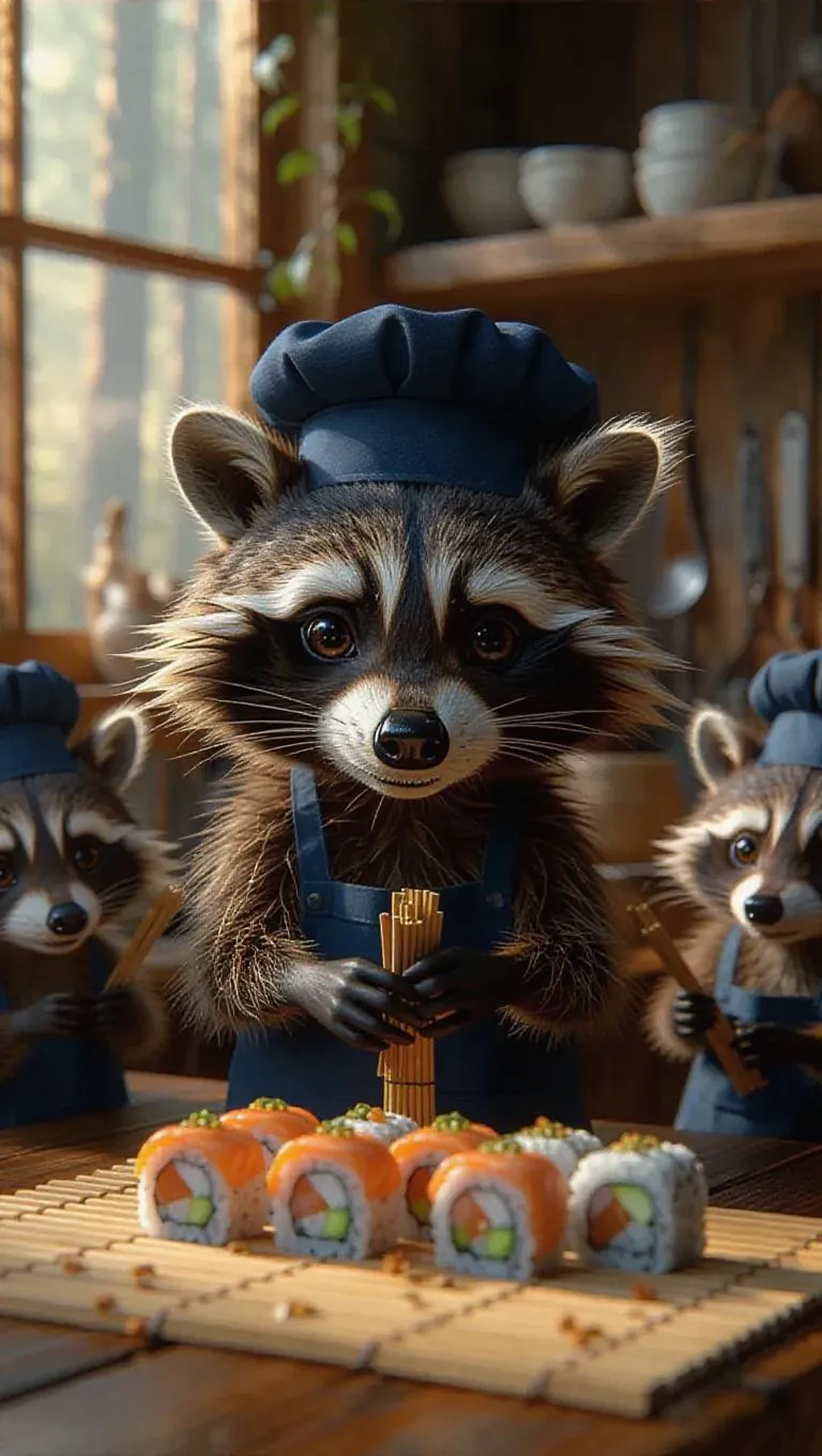4x image of a cartoonish raccoon wearing a blue apron and chef cap, meticulously rolling sushi on a bamboo mat in a cozy, bright, forest-themed kitchen. Baby raccoons, also in blue aprons and chef caps, sit on the counter, holding chopsticks, eagerly watching and learning.