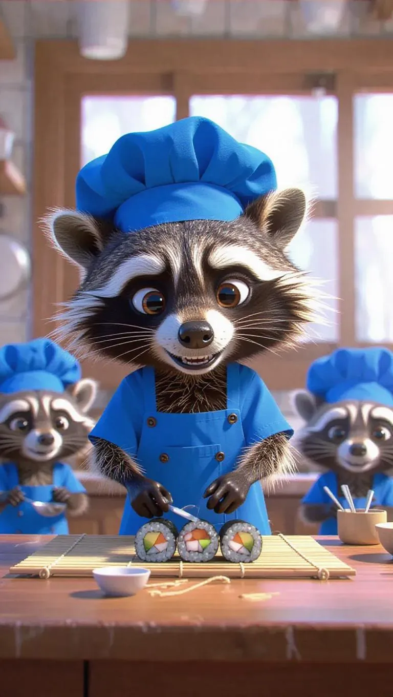 4x image of a cartoonish raccoon wearing a blue apron and chef cap, energetically rolling sushi on a bamboo mat in a cozy, bright, city-themed kitchen. Baby raccoons, also in blue aprons and chef caps, sit on the counter, holding spoons, eagerly watching and learning.