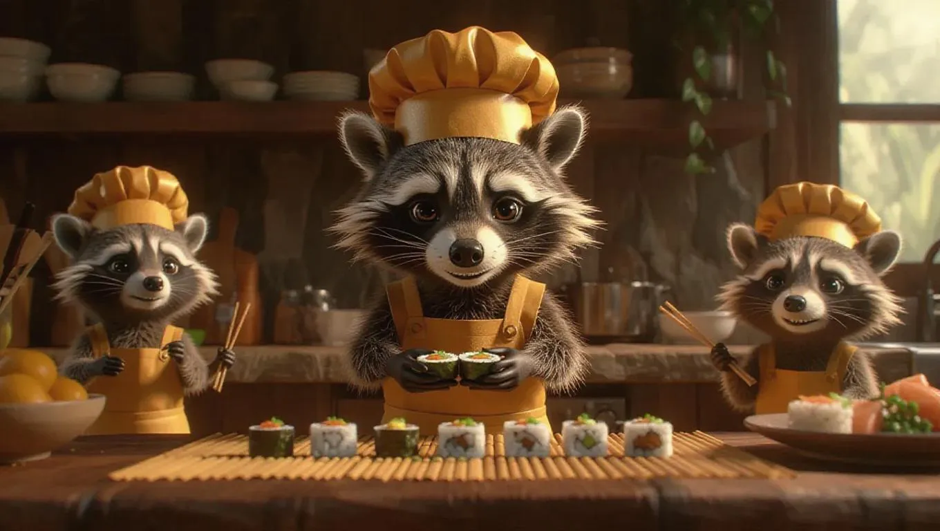 4x image of a cartoonish raccoon wearing a golden apron and chef cap, carefully rolling sushi on a fancy bamboo mat in a cozy, well-decorated, jungle-themed kitchen. Baby raccoons, also in golden aprons and chef caps, sit on the counter, holding chopsticks, eagerly watching and learning.