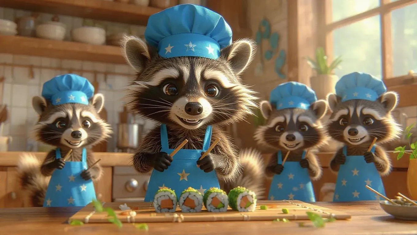 4x image of a cartoonish raccoon wearing a blue apron and a chef hat with stars, expertly rolling sushi on a bamboo mat in a cozy, bright, magical jungle-themed kitchen. Baby raccoons, also in blue aprons and chef hats with stars, sit on the counter, holding chopsticks, eagerly watching and learning.