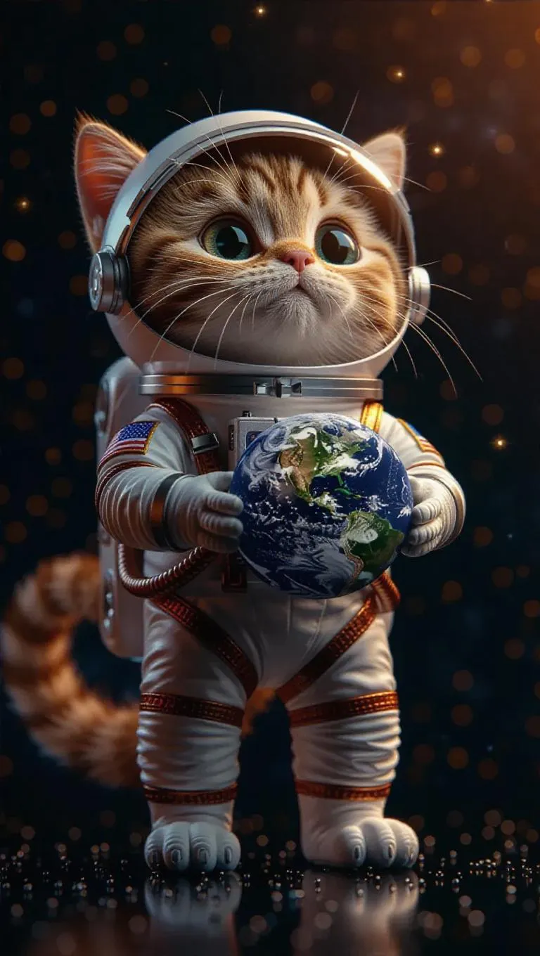 A 3D cat in a space suit, standing upright on two legs, holding a small planet model, surrounded by a cosmic backdrop and twinkling stars, exuding wonder and adventure, with a fascinated expression and a hint of playful excitement.