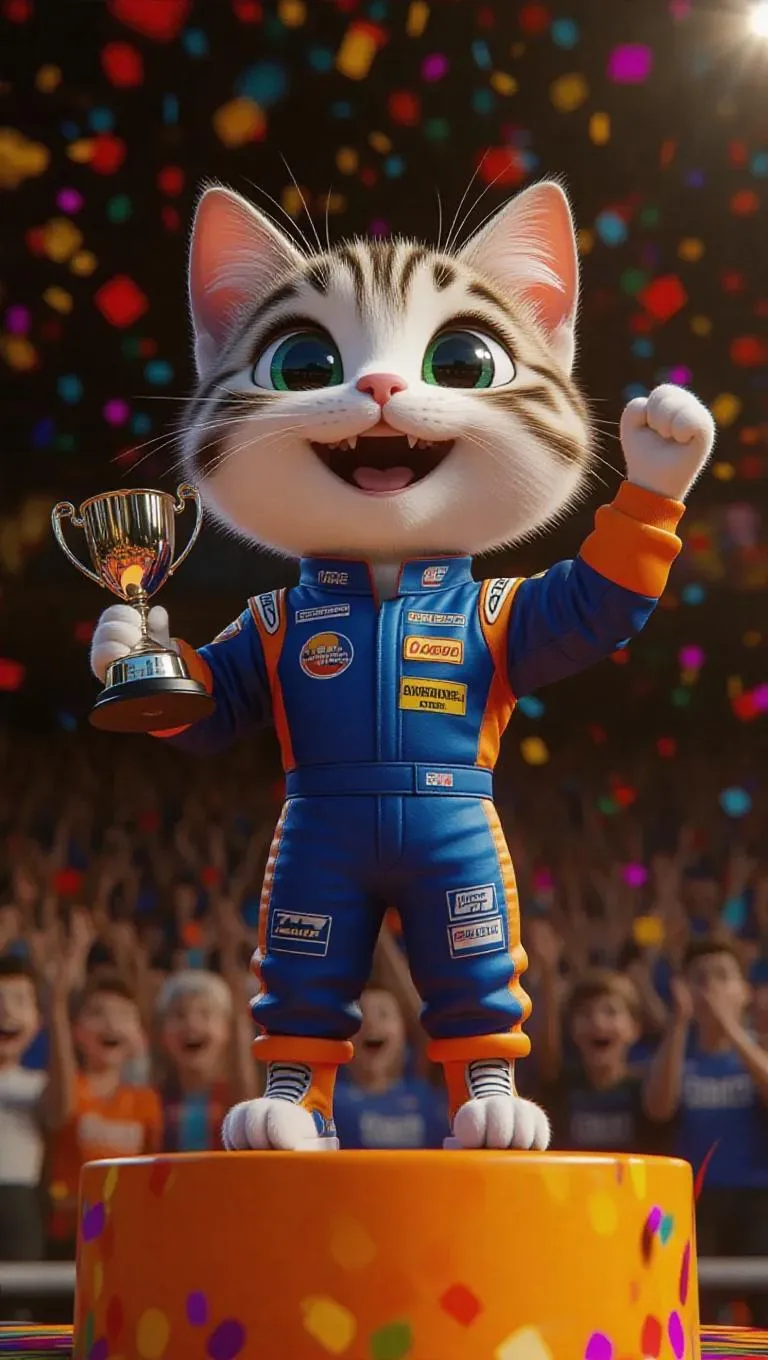 A 3D cat in a racing suit, standing on a podium, holding a trophy, surrounded by a cheering crowd and colorful confetti, exuding pride and achievement, with an excited expression and a hint of playful joy.