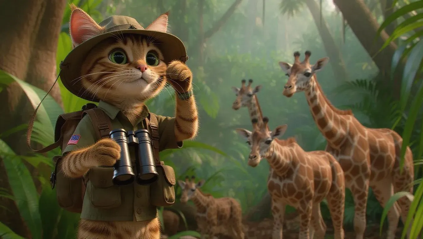 A 3D cat in a safari outfit, standing upright on two legs, holding a pair of binoculars, surrounded by a lush jungle landscape and wild animals, exuding adventure and exploration, with a curious expression and a hint of playful enthusiasm.